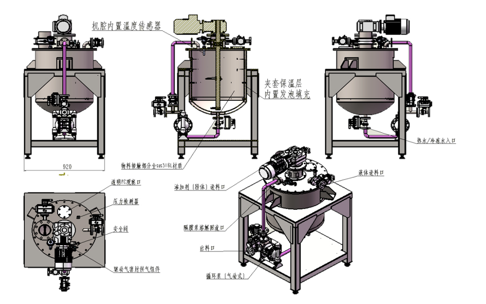 同步回流泵启动,将罐内底部浆料通过管路回流至罐内浆料上表面,增加均质及溶解效率,防止微颗粒物在罐内形成沉降;夹套配置发泡填充保温;